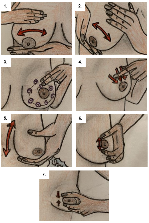 - Dann streichen Sie mit den Fingerspitzen rund um die Brust herum vom Brustansatz bis zur Brustwarze (siehe Abb. 4).
